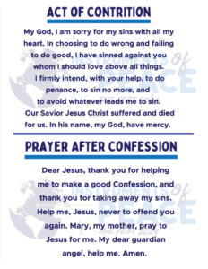 My God, I am sorry for my sins with all my heart. In choosing to do wrong and failing to do good, I have sinned against you whom I should love above all things. I firmly intend, with your help, to do penance, to sin no more, and to avoid whatever leads me to sin. Our Savior Jesus Christ suffered and died for us. In his name, my God, have mercy. Amen