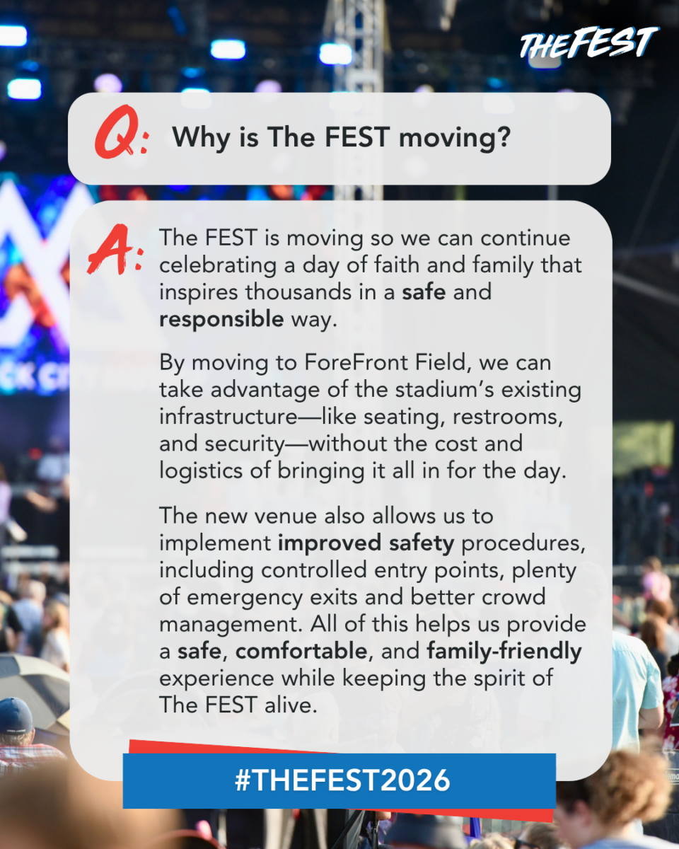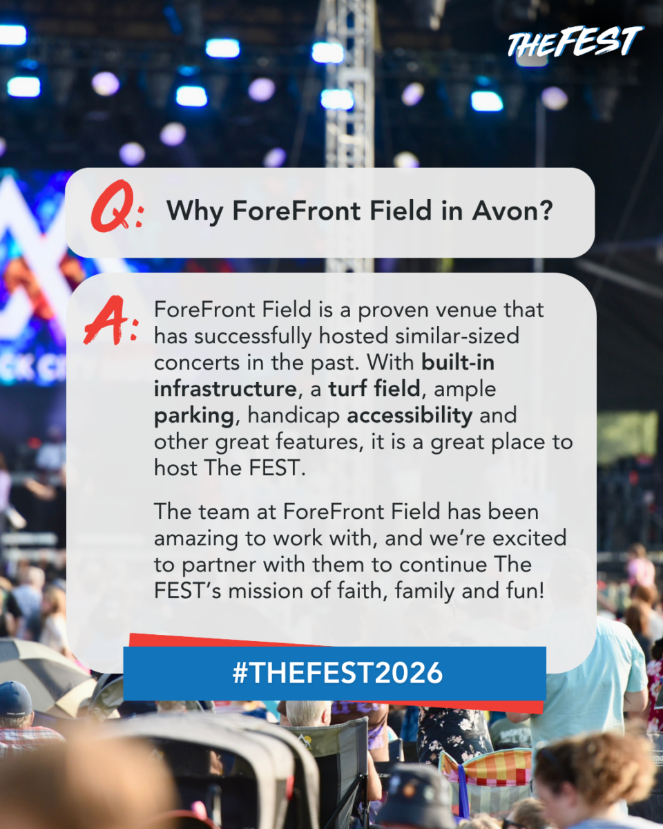 The FEST will take place at ForeFront Field in Avon, OH! The address is 2009 Baseball Blvd, Avon, OH 44011. The gates will open at 10:00 AM, while the music and activities will kick-off the day at 12:00 PM (Noon). Stay tuned for an updated itinerary for FEST Day 2026!